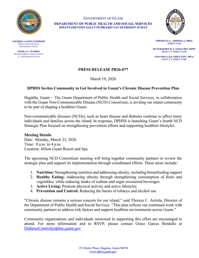 March 23, 2026 - 4th Non-communicable Disease Strategic Plan Meeting from 8:00 a.m. - 4:00 p.m. @ Hilton Guam Resort and Spa