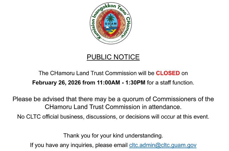 . The CHamoru Land Trust Commission will be CLOSED on February 26, 2026 from 11:00AM - 1:30PM for a staff function Date/Time: 02/25/2026 05:43 pm Category(ies): SHARE THIS Post The CHamoru Land Trust Commission will be CLOSED on February 26, 2026 from 11:00AM - 1:30PM for a staff function