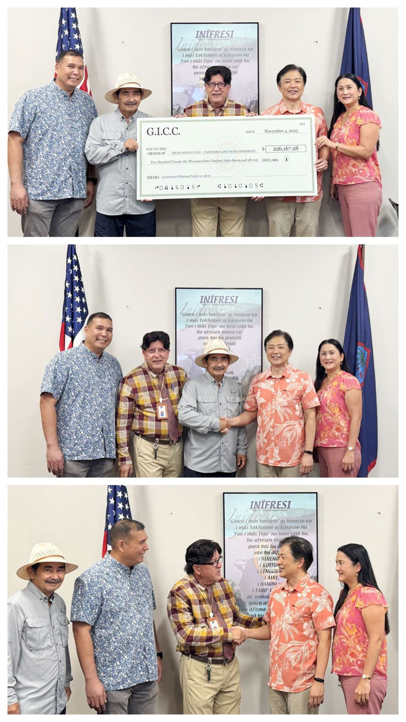 On January 15, 2026, the Guam International Country Club Inc. presented a check in the amount of $226,167.28 to the CHamoru Land Trust Commission, a commitment milestone under Public Law 38-61. Present at the event were CLTC Acting Chairman Earl J. Garido, Commissioner Fabrienne C. Respicio, Commissioner Jeremy J. Rojas, and Commissioner and PIO Joseph F. Artero-Cameron. GICC was represented by Mr. Jerry Tang.
